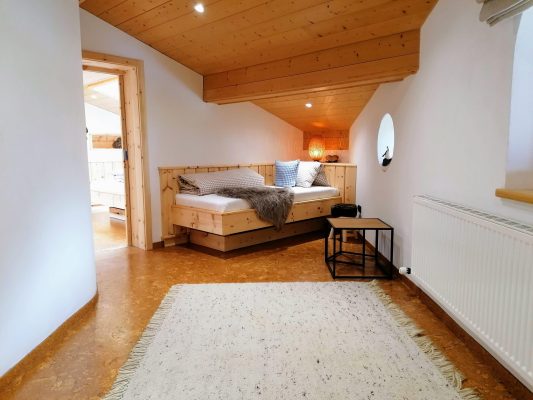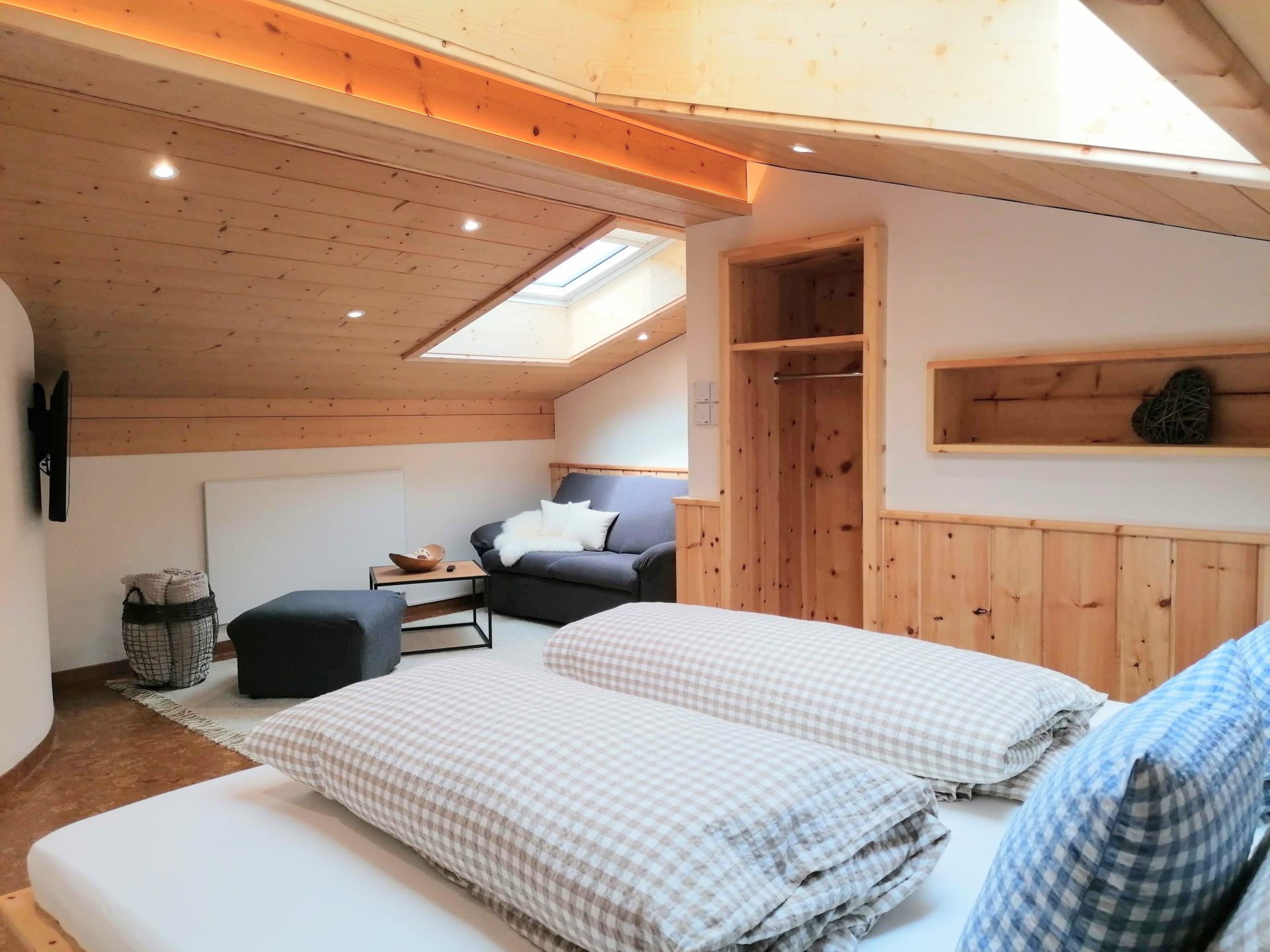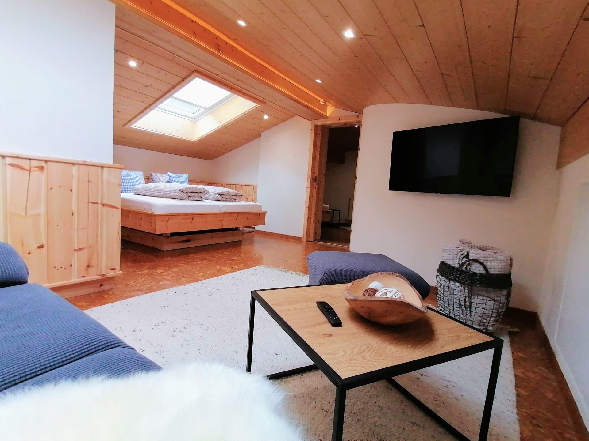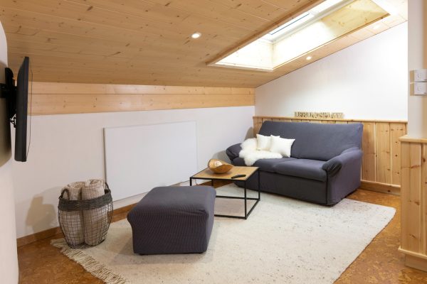 Das Wohnzimmer macht der Gemütlichkeit des traditionellen Holzbaustils alle Ehren. Es hat diesen Charme, den Cityhotels so gerne nachahmen würden. Hier ist leicht, es sich bequem zu machen und einen Abend mit Spielkarten, Wein und Snacks zu verbringen. Der Zugang zur Sonnenterrasse macht Sommerabende und auch Wintertage zu einem unvergesslichen Urlaub.
